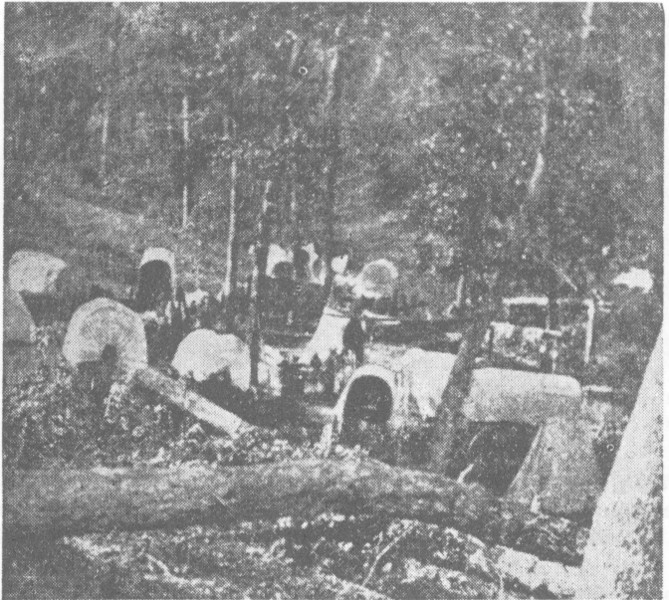 The rock shelter that served as a courthouse was under an overhanging ledge of rock that provided floor space about ten by thirty feet. The front was covered with rough boards with a wide opening for a door at one end. Near the door sat the barrel of moonshine whiskey which the judge used as a seat while conducting the trial. In front of him were a couple of two by four scantlings, resting on wooden boxes, which served as both a bar of justice and a bar for serving liquid refreshments. Several tin cups were on the improvised bar for the convenience of customers.