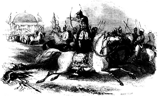 IT is no unusual circumstance in the East for deadly feuds, such as that detailed in the last chapter, to be occasioned by disputes for the possession of a horse. Quarrels of this kind are very common among the Arab tribes of the Desert, and are often perpetuated from generation to generation. The fatal beauty of Helen scarcely caused more disasters than have severally followed the abduction of many a famous steed. Runjeet Singh, the great ruler of the Punjaub, had a horse named Lylee, which he computed to have cost him 60 lakhs of rupees (£600,000) and the lives of 12,000 soldiers, having been the occasion of several wars. It was the property of Yar Mohammad Khan, of Peshawer; and Runjeet Singh, after a long contest with that potentate, made the delivery of the animal to him a primary condition of peace. Yar Mohammad tried many stratagems to evade this demand; first, he declared the horse was dead, and when this was discovered to be a falsehood, he made several attempts to palm off other horses on the conqueror, instead of the real Lylee. In the course of the negotiations, Yar Mohammad died, and was succeeded by his brother Sooltan Mohammad Khan, who also prevaricated as long as he could. But at last General Ventura, an Italian in Runjeet’s service, ended the matter by a bold stroke. Entering the reception room one day, he once more formally demanded Lylee, and when Sooltan Mohammad began to quibble as usual, Ventura called up his soldiers, whom he had posted in the courtyard of the palace, and pronounced the Khan a prisoner in his own capital. This so astounded the Khan, that he ordered the horse to be brought forthwith, and Ventura quitted Peshawer, with his costly booty.