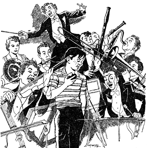 Just then the door opened and Timmy came walking through the musicians, eating an apple. Once he stopped to stare at the tympani and a second fiddler's bow kept running through his head. It was rather ghostly, Mrs. Briggs thought.