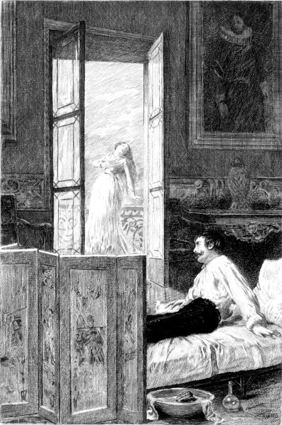 L’orage, longtemps contenu, se déchaîna enfin avec furie. Un rideau noir couvrit toute la vallée, et la pluie tomba dans le torrent comme un torrent nouveau. Le baron remit son cheval au galop, traversa le pont, suivit l’allée de platanes et ne tarda pas à disparaître. Sans s’occuper des imprécations de Lambernier, qui, au fond du fossé où il s’embourbait [Pg 14] de plus en plus, grognait comme un sanglier dans sa bauge, l’étranger allait chercher un abri moins illusoire que celui des arbres sous lesquels il avait pris position; mais, en ce moment, son attention fut invinciblement attirée du côté du château. Une fenêtre, ou plutôt une porte vitrée donnant sur le balcon venait de s’ouvrir, et une jeune femme en peignoir rose avait fleuri subitement sur la noire façade. Le mot dont nous nous servons n’est que juste, car il est impossible d’imaginer rien de plus frais et de plus suave que cette apparition dans un moment pareil. S’accoudant avec une molle lenteur sur la balustrade, la moderne châtelaine soutint d’une main semblable à un lis blanc son visage, dont l’ovale était aussi régulier que celui de la Pallas de Velletri, et ses doigts lissèrent par une caresse machinale les boucles de cheveux châtains qui encadraient son front, tandis que ses grands yeux bruns interrogeaient au fond des nuages les éclairs, avec lesquels ils luttaient de splendeur. Un poète eût cru voir Miranda évoquée par la tempête.
