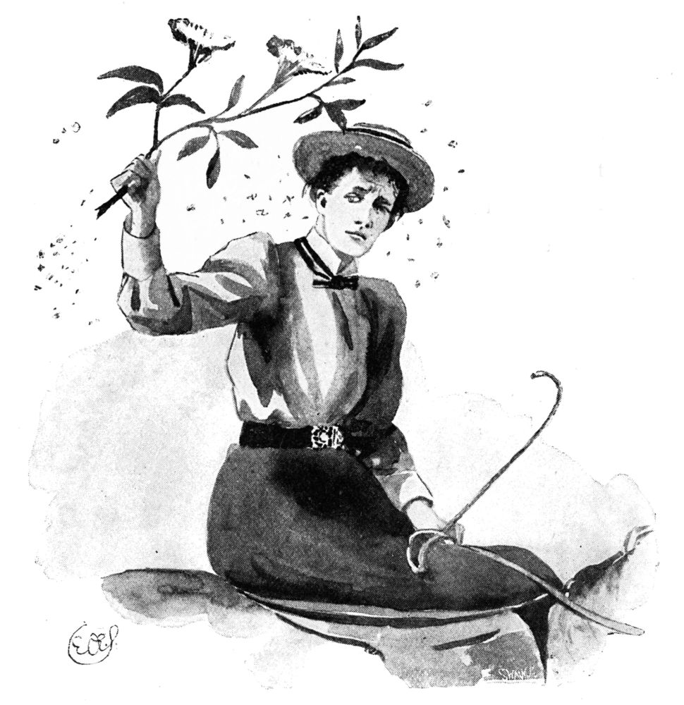 held high carnival in the garden above. It was here, probably, that Mr Willy Griffith cast his flies when in residence at the Griffith Arms; and Miss O’Flannigan absently added the figure of a youth of shop-walker beauty, in the guise of a fisherman, to the series of enervated scribbles which marked her sketch-book’s progress through that long hot Sunday. She was descending to the addition of{46} an eyeglass and a cigarette, when a pebble dropped into the water beside us. As we looked up to the parapet of the bridge, another pebble was dropped, and there was an eldritch falsetto laugh. We caught one difficult glimpse of a grey beard and a Tyrolean hat, a running footstep resounded above, and then silence. It seemed time for evening church, and we retired.{47}