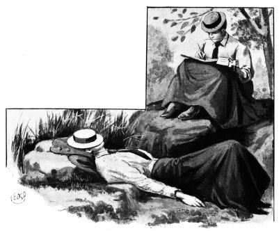 Next morning Miss O’Flannigan went out sketching. The casual reader may skim this information permissively, as a harmless, picturesque thing, very proper for young ladies; but to the companion of Miss O’Flannigan’s travels it has other aspects. For example, the aspect of Miss O’Flannigan herself, as she sat on a paling with her feet tucked up, her hat tilted over a scarlet face, and her teeth clenched on a spare paint-brush; or mine, as I leaned on the rail of a footbridge over against her, in the furnace heat of the sun, with what negligence remains to the model who has stiffened for twenty minutes in the attitude so lightly and luxuriously undertaken. It must be admitted, however, that the cold caught the night before{33}