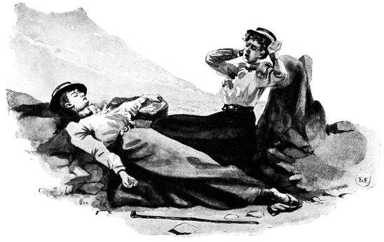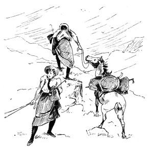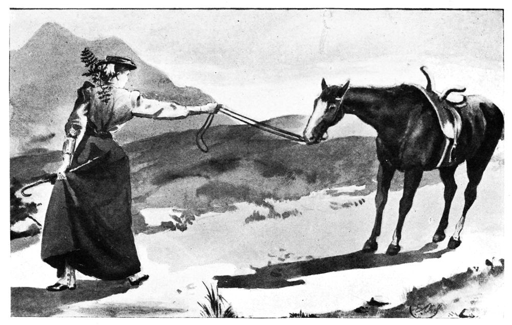 Before I had dismounted and reached the scene of the disaster Miss O’Flannigan was free: she had, in fact, rolled over the edge of the ledge into{130} a clump of heather, and was emerging from it, hatless, and in a state of the highest indignation. There is an unconscious, undesired picturesqueness about a person whose hair has come down, and I did not altogether refrain from mentioning this to Miss O’Flannigan, but she had lost her interest in the picturesque. The Tommies, fortunately, viewed the affair from one aspect only—that of a heaven-bestowed interval for food; and during the arduous processes of re-saddling and of binding the hold-alls, like burnt-offerings, to the horns of the saddles (for we had determined upon walking till we reached the top of the hill), they did not give us a moment’s anxiety.