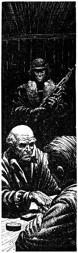 Outside, the temperature dropped to sixty degrees below zero. The stars sparkled with a brilliance that was reminiscent of outer space. Once the frosty stillness was broken by the whine of the jets of a cargo plane, hauling a train of ore gliders from the mines on an island farther north. In the front room of the center hut a guard sat, watching a number of television screens which showed the area around the camp bathed in infra red light. In front of the hut lay the convertiplane, a shining, bluish silver dart with its needle nose and swept back wings and tail. Near the cliffs back of the huts, Nolan's small two seater lay with its channel wings folded into the fuselage.