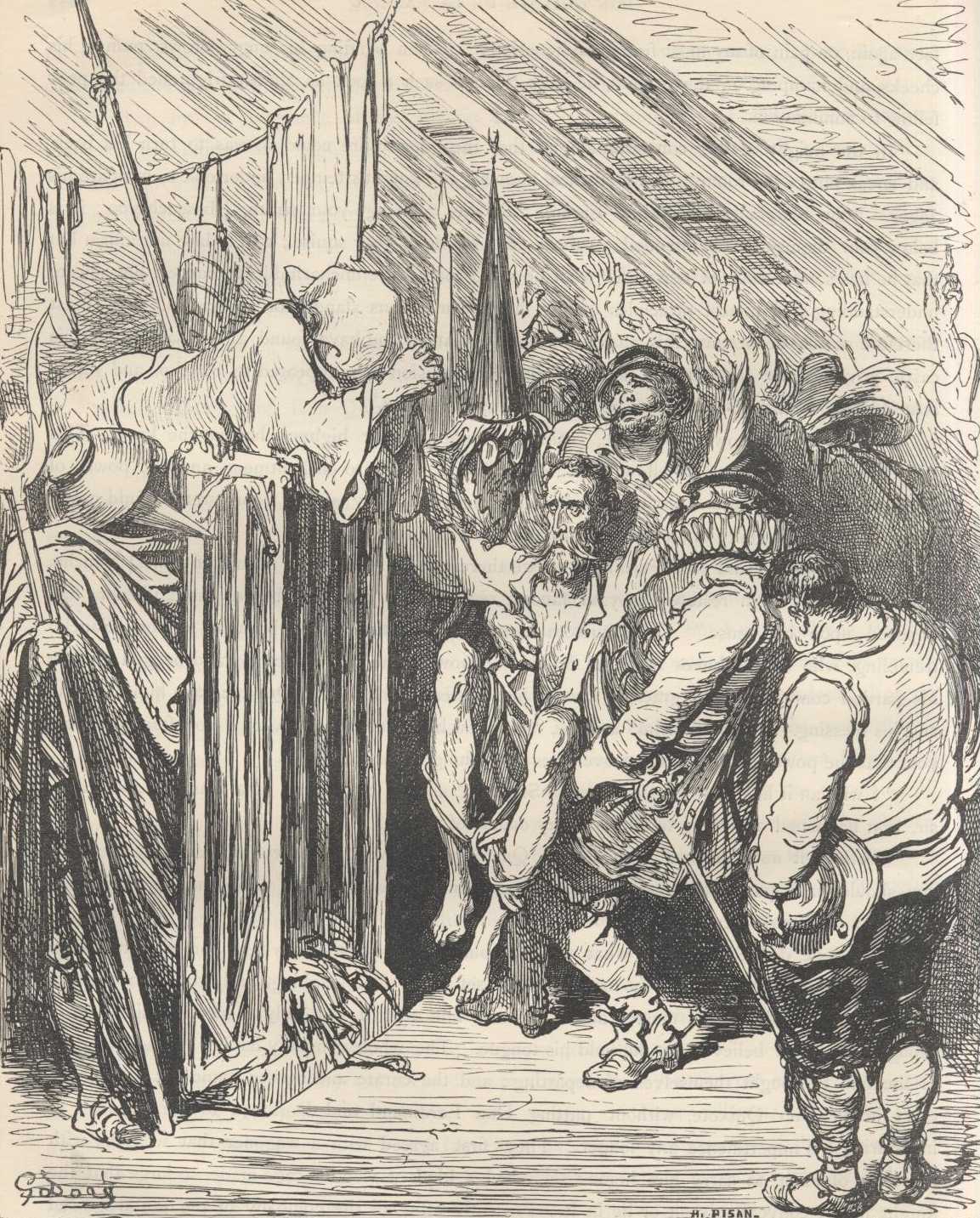 But the comrades of the spokesman, growing weary of the dialogue with Don Quixote, renewed their knocks with great vehemence, so much so that the host, and not only he but everybody in the inn, awoke, and he got up to ask who knocked. It happened at this moment that one of the horses of the four who were seeking admittance went to smell Rocinante, who melancholy, dejected, and with drooping ears stood motionless, supporting his sorely stretched master; and as he was, after all, flesh, though he looked as if he were made of wood, he could not help giving way and in return smelling the one who had come to offer him attentions. But he had hardly moved at all when Don Quixote lost his footing; and slipping off the saddle, he would have come to the ground, but for being suspended by the arm, which caused him such agony that he believed either his wrist would be cut through or his arm torn off; and he hung so near the ground that he could just touch it with his feet, which was all the worse for him; for, finding how little was wanted to enable him to plant his feet firmly, he struggled and stretched himself as much as he could to gain a footing; just like those undergoing the torture of the strappado, when they are fixed at "touch and no touch," who aggravate their own sufferings by their violent efforts to stretch themselves, deceived by the hope which makes them fancy that with a very little more they will reach the ground.