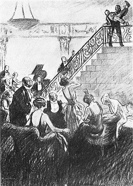 They bent over the music together and I turned back to the audience. There were only two others who showed any disposition to follow the example of the lady in blue satin. One was the young man whom I had previously noticed, and who had now risen to his feet. It was obvious that the girl by his side was[Pg 20] doing all she could to dissuade him from his purpose. I could almost hear the sob in her throat as she tried to drag him back to his place. I myself felt curiously indisposed to interfere, but Leonard, who was standing by my side, and who saw them for the first time, imagining that a word of encouragement was all that was necessary, concluded the business.