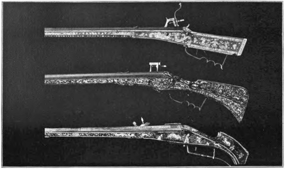 Hand-guns of the later middle ages and the “renaissance” may be divided into plain weapons for the ordinary soldiers, and decorated guns for leaders and parade, besides hunting purposes. Brescia was a great centre for their manufacture. Numbers of these guns were fired without touching the shoulder, the recoil227 being provided for by placing the thumb firmly against the nose.