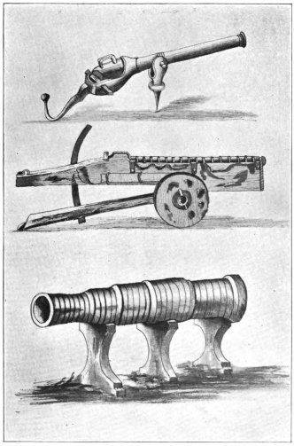 The type of weapon used by a contingent of three hundred Flemings in the ranks of the army of Edward IV. in 1471 was the hand-culverin; and the English Yeomen of the Guard were armed with it in 1485, as also was the Swiss contingent of six thousand men at the battle of Morat in 1476. These hand-culverins were each served by two men, one for holding the gun, and the other for applying the match, etc.; they were fired by a fuse-cord.