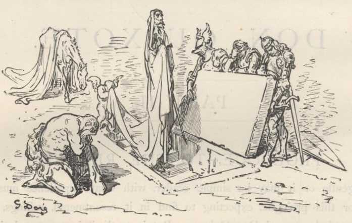 The book cover and spine above and the images which follow were not part of the original Ormsby translation—they are taken from the 1880 edition of J. W. Clark, illustrated by Gustave Dore. Clark in his edition states that, "The English text of 'Don Quixote' adopted in this edition is that of Jarvis, with occasional corrections from Motteaux." See in the introduction below John Ormsby's critique of both the Jarvis and Motteaux translations. It has been elected in the present Project Gutenberg edition to attach the famous engravings of Gustave Dore to the Ormsby translation instead of the Jarvis/Motteaux. The detail of many of the Dore engravings can be fully appreciated only by utilizing the "Enlarge" button to expand them to their original dimensions. Ormsby in his Preface has criticized the fanciful nature of Dore's illustrations; others feel these woodcuts and steel engravings well match Quixote's dreams. D.W.