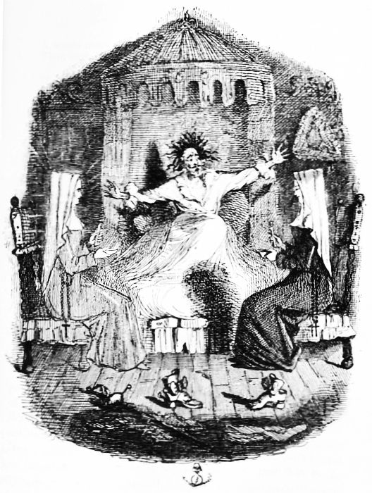 Sir Walter has dress'd himself up like a Ghost, And frightens a soldier away from his post; Then, discarding his helmet, he pulls his cloak higher, Draws it over his ears and pretends he's a Friar. This gains him access to his sweetheart, Miss Faucit; But, the King coming in, he hides up in her closet; [Pg 506] Where oddly enough, among some of her things, He discovers some arrows he's sure are the King's, Of the very same pattern with that which he found Sticking into his father when dead on the ground! Forgetting his funk, he bursts open the door, Bounces into the Drawing-room, stamps on the floor, With an oath on his tongue, and revenge in his eye, And blows up King William the Second, sky-high; Swears, storms, shakes his fist, and exhibits such airs, That his Majesty bids his men kick him down stairs.