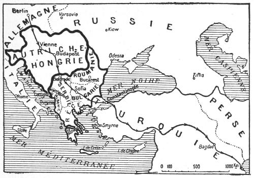 The accompanying map furnishes the justification of this conclusion. It is obvious that the German gains on the West and the East, important as they are, are relatively small by comparison with the enormous seizures which Germany has effected at the expense of Austria-Hungary, of half the Balkans, and of Turkey. We must fully understand that these countries, especially Austria-Hungary, though they are allies of Germany, are nevertheless as truly under the German heel as Belgium, Poland, or the invaded departments of France. There is therefore good ground for making no distinction between the Pangerman gains achieved by Germany at the cost of her open enemies (France and Russia) and those which the Government of Berlin has treacherously effected at the expense of her own allies, like Austria-Hungary.