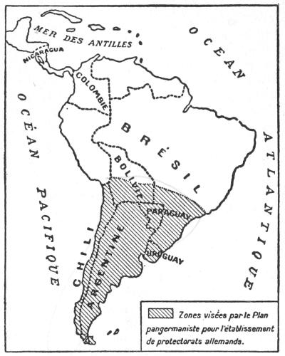 The second map shows the group of States in Asia and America which, menaced by the world-wide consequences of the “Hamburg to the Persian Gulf” scheme, have also a high and direct interest in the solution of the Austro-Hungarian question. Japan is already helping the Allies notably, but her assistance might be still ampler, more effective and more direct. The strictest view of her interest should compel her to enlarge the scope of her succour, since nothing but the total defeat of Germany in Europe can prevent Japan from witnessing a long series of disturbances fomented at her expense in the Chinese Empire (see p. 98). As I have already shown (p. 105) many States in South America are directly aimed at by the Pangerman[234] plan of 1911. But that plan can never be really formidable for these States, unless Germany should one day have at her disposal the powerful resources which would accrue to her from the accomplishment of the scheme “from Hamburg to the Persian Gulf.” Chili, Argentina, Uruguay, Paraguay, Bolivia, Colombia, Brazil, have all been the object of preparatory Pangerman manœuvres. That warning ought to convince them without delay that they have an undoubted interest in co-operating, to some extent, in the common cause. They could do so, particularly Argentina and Brazil, to good purpose in the economic sphere.