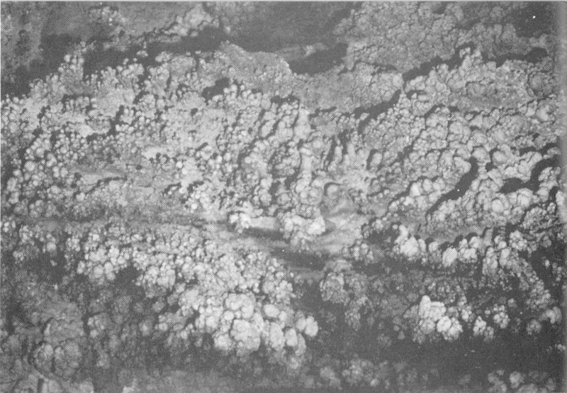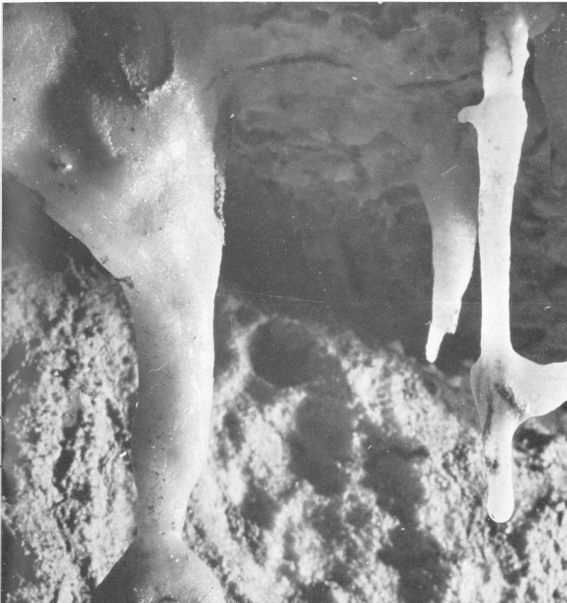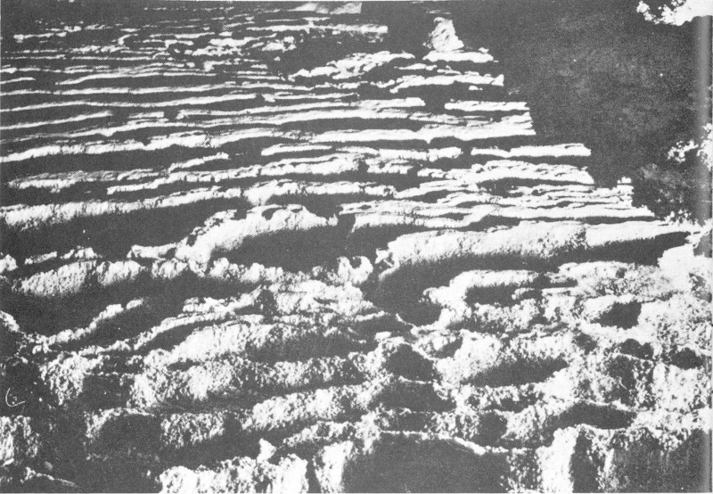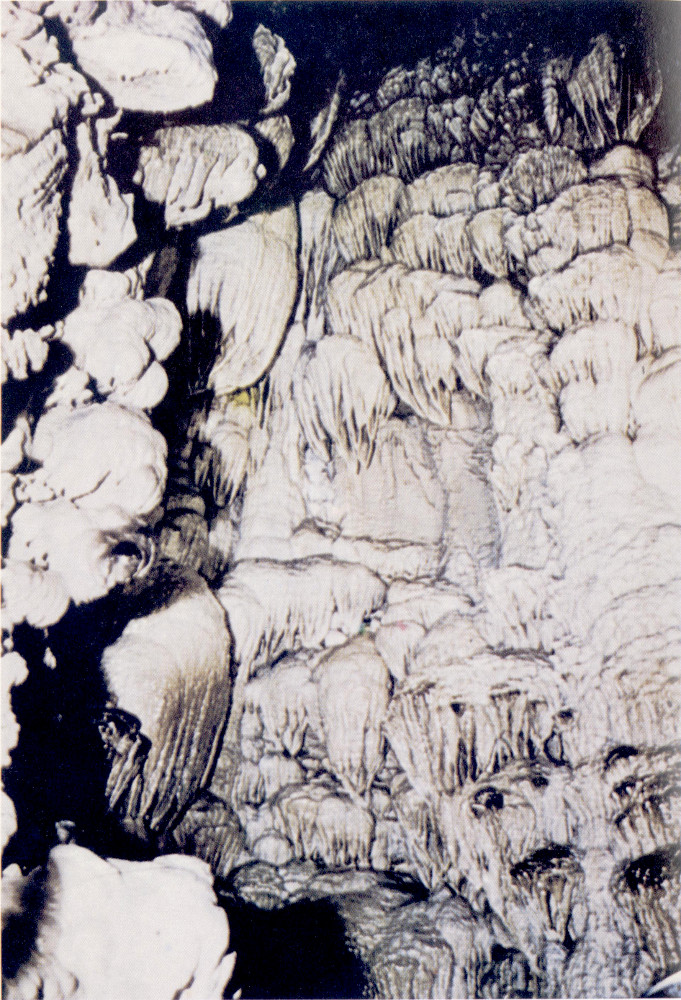 At the “Devil’s Washboard,” and at the foot of Paradise Lost, we find still another type of speleothem—rimstone—which forms in pools of water. Agitated by dripping or flowing water, some of the carbon dioxide in the pool escapes. The resultant deposition of mineral takes place on irregularities in the bottom of the pool, or creates stone wavelets where the pool spills over. Ridges and dams subsequently build up, often constricting the pool surface (see illustration on page 22). Another type of rimstone, or cave ice, develops when flowstone builds up around the edge of a pool and gradually closes across it. The pool may be completely sealed over, just like a pond in winter, except that “cave ice” can never melt.