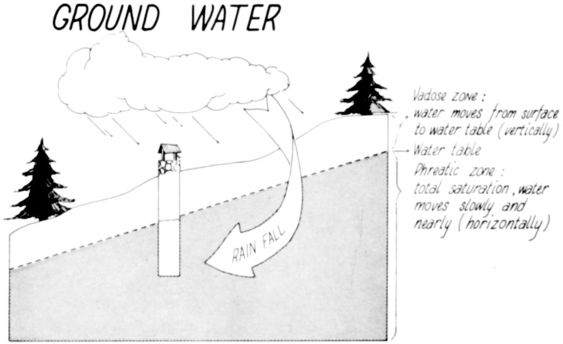 Here cracks, pores, and all spaces within the rock are completely filled with water. There are no airspaces. Water movement within the phreatic zone is comparatively slow, varying from a few inches a year to a few feet a day, depending upon the permeability of the rock structure. And the movement is usually horizontal, following the contours of the land in the same direction as surface streams. Eventually this water will find its way back to the surface at a lower elevation where it usually emerges as a spring. It is phreatic water which feeds the mountain streams and rivers many weeks or months after the last rainfall. It might also be pumped from a well for human use. A large portion of the earth’s population depends upon well water from these great underground reservoirs.
