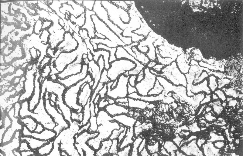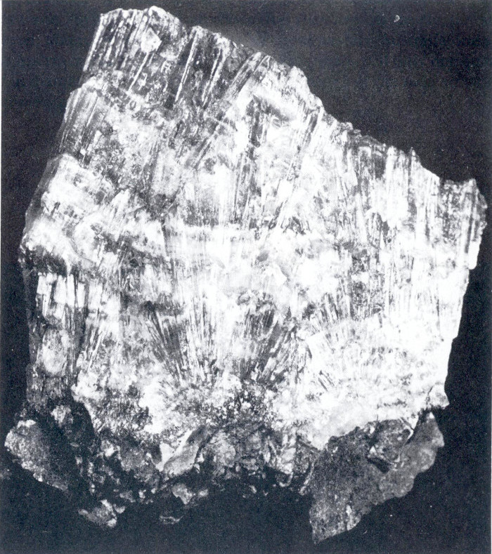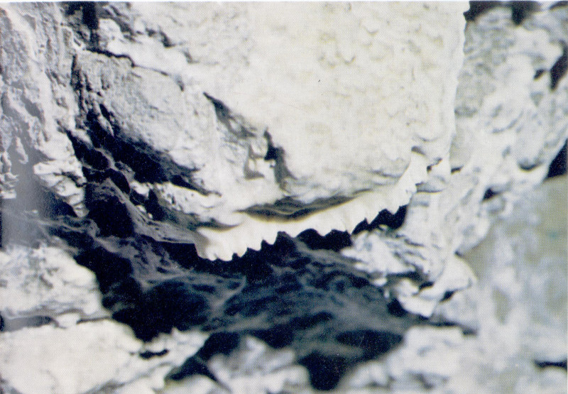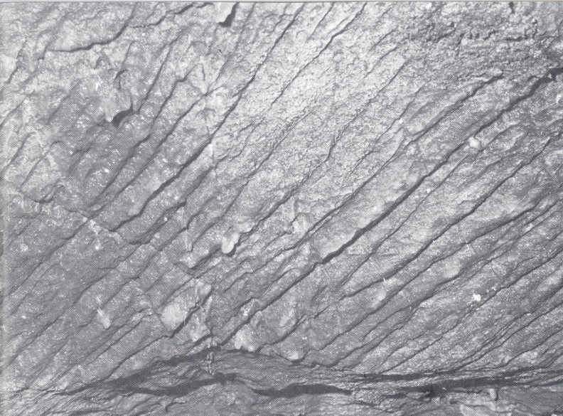 Cave students are often confused by another deposition found in the form of thin blades jutting out of the wall (see illustration below). They have a woven, crystalline texture. Prior to removal by solution, some of the marble cracks were filled with calcium carbonate. Being less soluble than marble, the sheets of calcite crystals remain for a time after the surrounding rock is dissolved away.