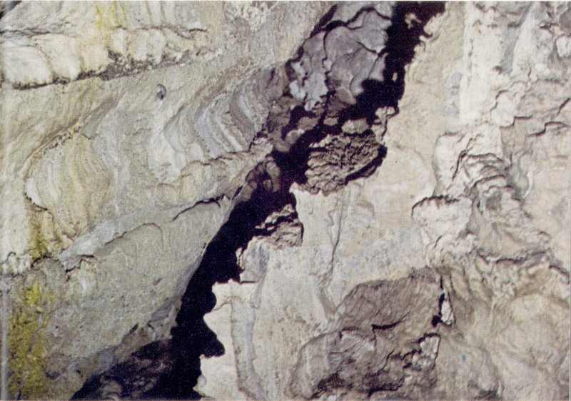 It was thus that phreatic water, charged with soil acids, percolated century after century through cracks in the marble. The acids ate away at all exposed rock surfaces—sideward, downward, and upward. (The solution rills in the original Ghost Room ceiling reveal the upward dissolving of water-filled cavities, see illustration page 9). To fully understand this, we must recall that the marble is 93 percent calcium carbonate (CaCO₃). To dissolve it, carbonic acid mixes with the calcium carbonate to form an unstable liquid compound called calcium bicarbonate, (CaH₂(CO₃)₂). The removal of solid calcium carbonate in 11 a liquid is the key cave forming process and is called solution (see illustration page 10). In Watson’s Grotto we find several examples of early crack-widening by phreatic solution (see illustration page 9).
