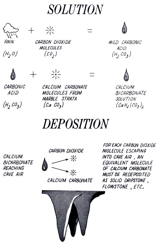 Rain falling on the mountains above the cave seeps into the surface cover of vegetation and humus. Here it absorbs carbon dioxide released from the process of organic decay. Seeping further through the vadose zone and down to the water table, this water carries many times the normal amount of carbon dioxide found in the atmosphere. In fact, it becomes acid. For water (H₂O) and carbon dioxide (CO₂) unite to form a mild solution of carbonic acid (H₂CO₃). In this manner, phreatic water is constantly charged with mild acids. Not the kind that harm us, of course. The fountain water by the chalet, and probably that in your home, is actually mild carbonic acid. So is bottled pop.