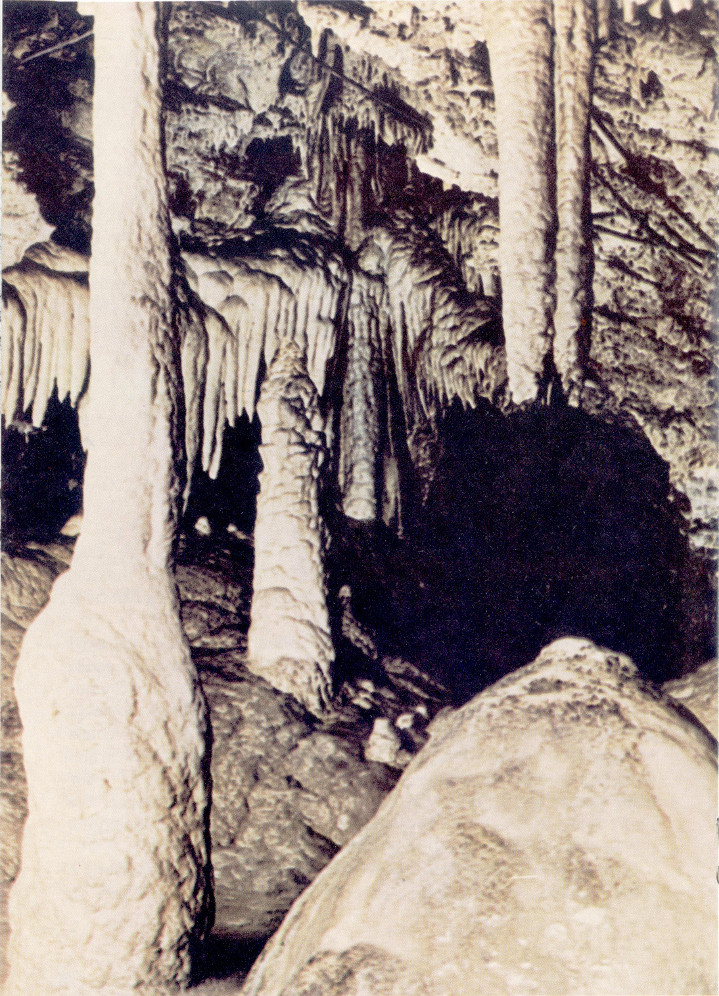 Soon they knew the Davidson story was true, more than true. Crawling from one chamber to another, they found a fairyland of weird grottoes and exquisite stone formations—pillars and spires, drapes, frozen waterfalls and grotesque forms—in shapes and sizes beyond their imaginations. Some they named from resemblance to familiar objects. At others they could only stare in awe and wonder how can it be? Using the rope in steep places, they probed upward into another level of caverns where they were thrilled to find even more elaborate formations. At one place they wrote their names and the date, July 11, 1879. Here and there they saw 2 evidence left by the few others who had entered the cave in the five years since it was discovered by their neighbor, Elijah Davidson. On and on they explored, returning to the entrance only when their last candle was growing short. Outside, stars lighted a midnight sky. Exhausted, happy, they vowed to return, then fell into bedrolls.