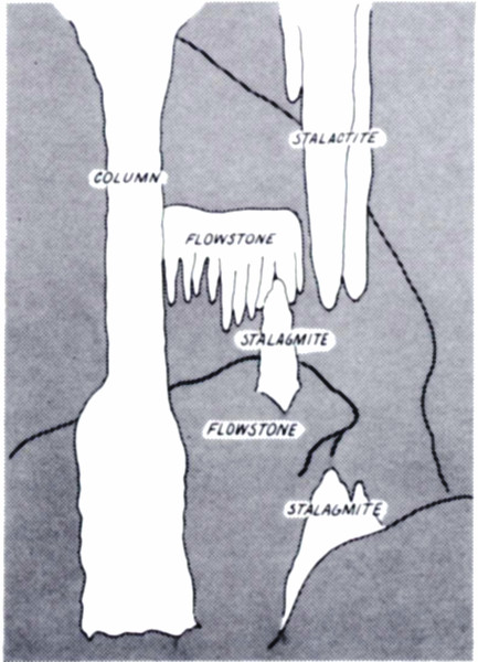 Before going on, let us define the word cave as we consider it here. True caves are formed in soluble rock—limestone, marble, gypsum or dolomite. They usually contain some redeposited mineral in the form of stalactites, etc. As most caves occur in limestone, the term limestone cave is often used to describe any true cave, even though it may actually occur in dolomite or marble. The cave-forming process will be basically the same for either type of soluble rock. We exclude from this definition mines, lava tubes, ice caves, and sandstone depressions such as those used by cliff-dwellers in the Southwest. While they are “holes in the ground,” they are formed in different ways than are the limestone type caves, and therefore are not usually referred to in geological discussions of caves.
