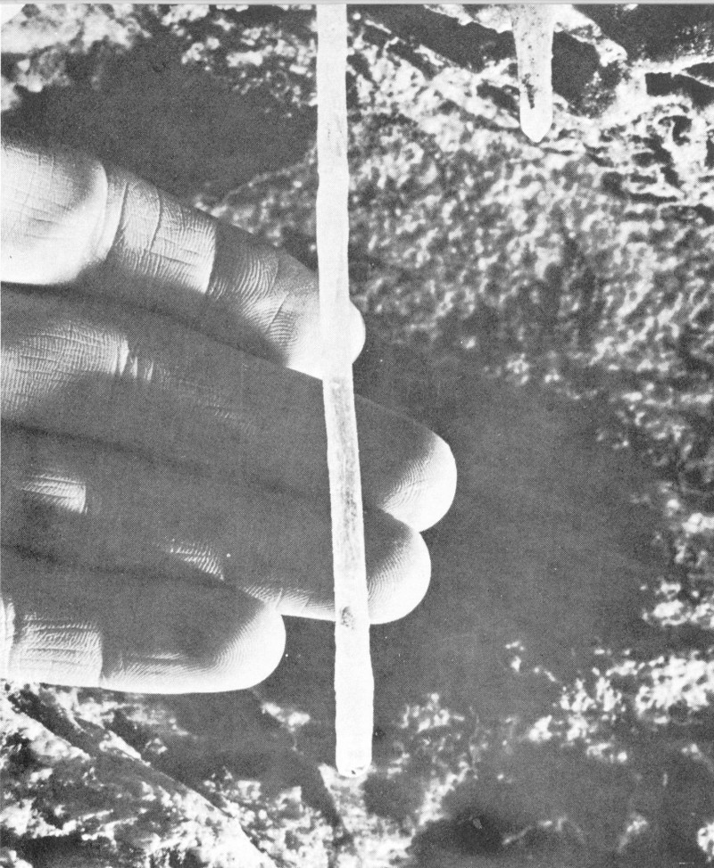Most shapes and forms of dripstone and flowstone are occasionally duplicated by freezing water. Stalactites form on the edges of roofs, stalagmites form on the sidewalk beneath them, etc. But one of several cave formations which can’t be thus copied is the soda straw (see illustration page 20). Deposition begins as a ring of calcium carbonate around a water drop. The ring has the unique feature of being a single crystal. As 19 more drops leave their deposits, the ringed crystals form one on the other to create a tube. The water continues to seep through the inside of the tube, eventually producing the fragile, crystalline pipe with the obvious name.