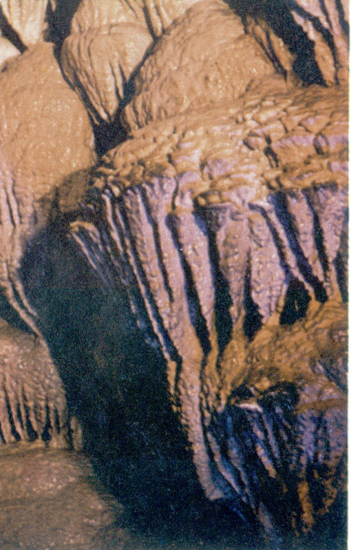 Contrasted with dripstone is flowstone—smooth layered deposits left along walls and floors by flowing water. In Joaquin Miller’s Chapel, flowstone deposits are many inches thick. (See illustration on page 16). A close look at the structure of dripstone and flowstone reveals six-sided crystals called calcite, which is merely the crystalline form of calcium carbonate. (See illustration on page 19). Banded crystal layers in cave deposits are often called alabaster, or cave onyx. These can be easily seen at the “wishing post.”