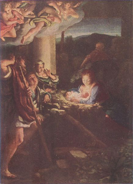 Doch auch von oben her nimmt die himmlische Liebe teil. Gott Vater selbst läßt die weiße Taube des heiligen Geistes herabflattern, und zwei schwebende Engel, die den goldbrokatenen Vorhang raffen, blicken segnend nieder auf Mutter und Kind und ihre himmlischen Gespielen.