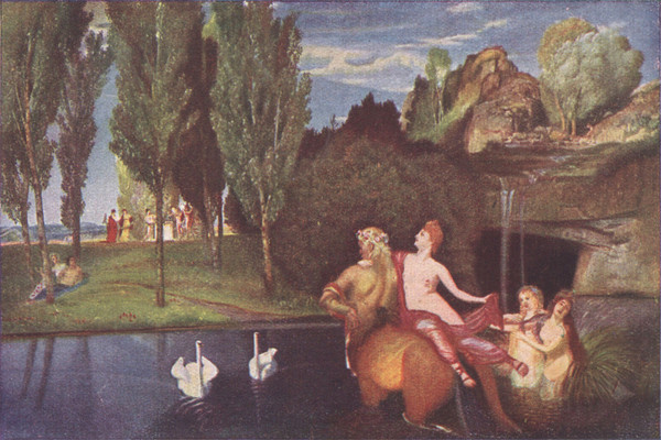 Im Jahre 1894 übersiedelte der Meister nach Maloja, und nun begann auch jene letzte Periode seines Schaffens, in der dies nicht mehr an den schweren Geschehnissen des Lebens klebte, in der vielmehr seine Kunst sich zu immer höheren Flügen der Phantasie und der Gedanken aufschwang. Da entstand das liebliche Bild „Liebesfrucht“, der „Engel des Lebens“, die Phantasie der „Schlechten Mütter“, die „Liebe am Born des Lebens“, der „Quell des Übels“, „Musik“.