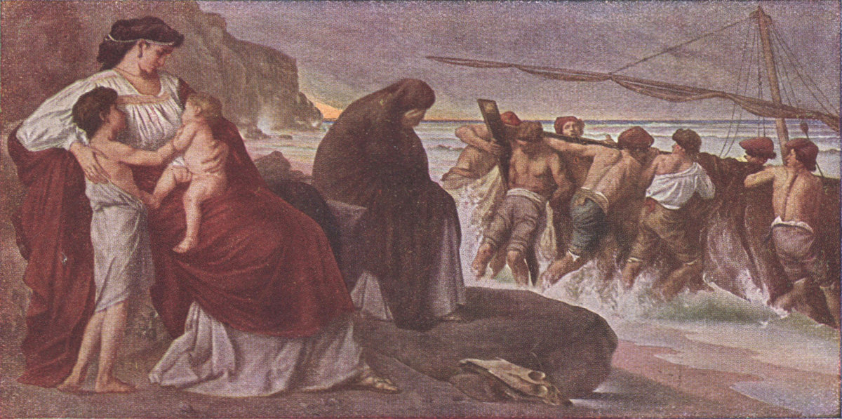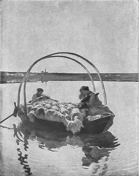 Tiefster Friede über dem weiten See. Nichts bewegt die klare Wasserfläche als der Ruderschlag des Schiffers, der eine junge Mutter mit ihrem Kinde und eine dichtgedrängte kleine Herde von Schafen in seinem Kahn übersetzt. Am fernen Ufer spiegelt sich eine Ortschaft im Wasser, und ihr spitzes Kirchtürmlein hebt sich von der reinen Abendluft ab. Von da drüben tönen die Aveglocken herüber, deren Klang der ganzen lieblichen Szene die Stimmung gibt. Die Frau mit dem Kindchen sitzt andachtsvoll, ruhig im Kahn, wie ein Urbild der Madonna, und auch der Schiffer scheint seine Ruder einen Augenblick, wie betend, ruhen zu lassen. Die friedvollste Szene, die ein Mensch erdenken kann, ein Bild, vor dem man vergißt, daß es Häßliches, daß es Haß und Streit gibt auf der Welt. Und doch, trotz aller fast überirdischen Lieblichkeit, alles gesehen, alles wahr!