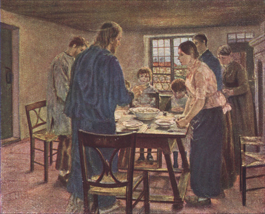 Ehe sich die Familie zum Essen setzt, wird das Tischgebet gesprochen. Es ist das uralte: „Komm, Herr Jesus, sei unser Gast und segne, was du uns bescheret hast. Amen.“ Woher dies Gebet stammt, läßt sich nicht nach[S. 314]weisen. Der Volksmund hat es geformt, vielleicht schon vor Jahrhunderten, in dem innigen Glauben, daß auch des Leibes Nahrung von Gott kommt und des Segens des Himmels bedarf. Und während dies Gebet gesprochen wird, erscheint der Herr Jesus Christus selbst, wie eine Lichtgestalt, und erhebt segnend seine Hand.