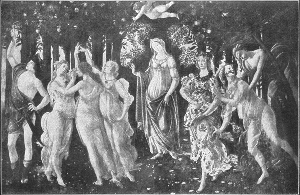 Diese Pracht und Herrlichkeit, die uns einmal alljährlich beglückt, hat auch den Meister Sandro (Alexander) Botticelli, der während der zweiten Hälfte des 15. Jahrhunderts (1446 bis 1510) in der italienischen Stadt Florenz lebte, zu so hoher Begeisterung hingerissen, daß er uns diesen herrlichen Farbenhymnus an den Frühling dichtete. In dem zauberreichen Gemälde zeigt er uns das ewige[S. 16] Wunder der Schöpfung, wie es sich in seiner Phantasie malte. In uns, den Beschauern, will er die gleichen Gefühle der Erhebung und Erneuerung wecken, die mit des Frühlings Einzug seine Seele beglückten. In jedem Lande der Erde hat der Frühling ein eigenes Gesicht; in allen Zonen aber ist er von märchenhafter Prachtenfaltung in der Natur begleitet. Botticelli nun schildert uns den Frühling, wie ihn sein Künstlerauge in seiner toskanischen Heimat sah. Er folgte der Stimme des Herzens und malte, was seine Phantasie bewegte: