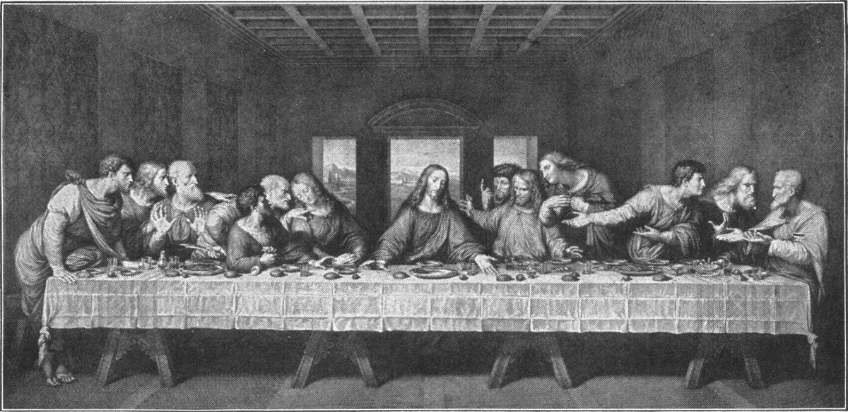Das weltberühmte Hauptwerk des Leonardo da Vinci ist uns nicht so überliefert, wie unsere Abbildung vermuten lassen könnte. Das wunderbare Bild, bei dem Leonardo das Wagnis unternahm, mit Ölfarben unmittelbar auf die Mauer zu malen, um besonders starke farbige Wirkungen zu erzielen (während man sonst bei solchen Arbeiten andere, praktisch besser brauchbare Malmittel, vor allem Temperafarben, verwendet) — es ist heute nur eine Ruine. Klagend, doch hilflos stehen die Kunstfreunde seit Jahrzehnten vor dem verfallenden Gemälde, dessen Farbschichten man nach und nach zerbröckeln und von der Wand sinken sah, ohne den fortschreitenden Zerstörungsprozeß wirksam aufhalten zu können. Um einen Begriff von der ursprünglichen Gestalt und Herrlichkeit des Werkes zu erlangen, das wir mit Trauer allmählicher Vernichtung preisgegeben sehen, muß man die glücklicherweise in großer Zahl vorhandenen Kopien von Leonardos Schülern und Nachfolgern, sowie die Studienzeichnungen, die der Meister selbst vor der Arbeit und hernach Jüngere nach dem vollendeten Gemälde gemacht haben, hinzunehmen. Mit Unterstützung solcher Hilfsmittel haben hervorragende Meister des Kupferstichs große Blätter geschaffen, die uns nun in der Tat eine treue Vorstellung[S. 22] von dem Mailänder Original vermitteln, wenn sie auch freilich die Schönheit seiner farbigen Harmonien, die unwiederbringlich verloren bleiben, nicht ersetzen konnten. Ihnen dankt es die Gegenwart, wird es die Zukunft danken, daß wenigstens ein Abglanz von der ewigen Pracht dieser Schöpfung erhalten blieb.