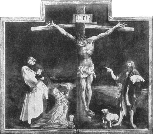 Aus der Tiefe hinten weint ein bleiches Grün, schattenhaft und ungewiß stehen die Hügel der Ferne. Vorn oben ragt das Kreuz in den finsteren Himmel, gegen den sich der Körper Christi abhebt, verzerrt durch die Krämpfe des Martertodes und in dieser Verzerrung erstarrt, in der Farbe der beginnenden Verwesung, und in dem Leichengrün blutrot die Wunden von Nagel und Dorn.