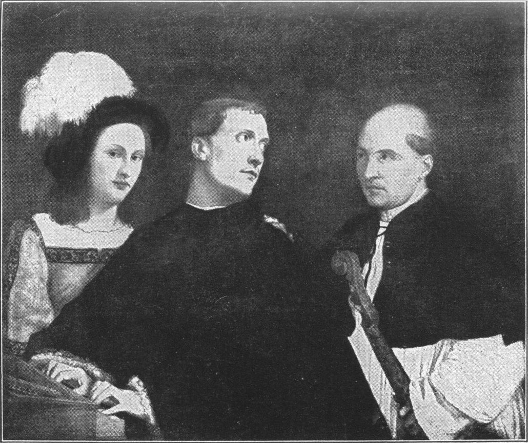 Im Mittelgrunde des Bildes erblicken wir eine feengleiche Frauengestalt, Venus, die Göttin der Liebe. Wie eine Königin schreitet sie daher, voll Hoheit und Würde. Der purpurne, golddurchwirkte Mantel ist herabgesunken, er wird von der linken Hand leicht gerafft, während er lässig über den rechten Arm hinabgleitet, der wie in segnender Gebärde erhoben ist. Das Antlitz der Liebeskönigin ist von holdseligem Lächeln verklärt; um das leicht geneigte Haupt fließt in sanften Linien ein goldgewebter Schleier, die edle Stirn verrät hoher Gedanken Flug.