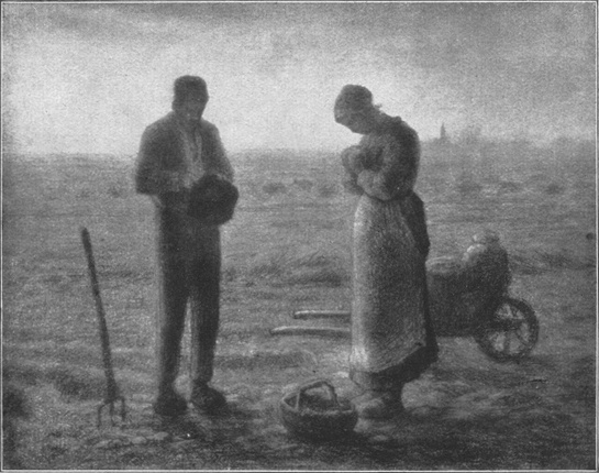 So lebt er in der nachschaffenden Erinnerung des Christentums — und so sehen wir ihn auf dem berühmten Bilde Fritz von Uhdes, das hier in seiner farbigen Wirkung wiedergegeben ist. Das Zuständliche ist eine Bauernstube, dem Eindruck nach eine holländische oder eine aus dem deutsch-belgischen Grenzgebiet, die Wände kahl, der Boden mit Ziegelfliesen belegt. Durch das gardinenlose Fenster fällt der Blick auf flaches Land und das rote Dach eines Fabrikgebäudes, über dem noch der Himmel blaut, sich aber schon in zartes Dämmerlicht einwebt. Die Armut wohnt in diesem kärglichen Heim. Doch alles ist blitzsauber, auch der zur Abendmahlzeit hergerichtete Tisch mit dem großen Kartoffelnapf in der Mitte. Mann und Frau stehen sich gegenüber, er noch in seiner Arbeitsbluse, hinter der Frau wird das Elternpaar sichtbar, am Ende des Tisches warten die Kinder.