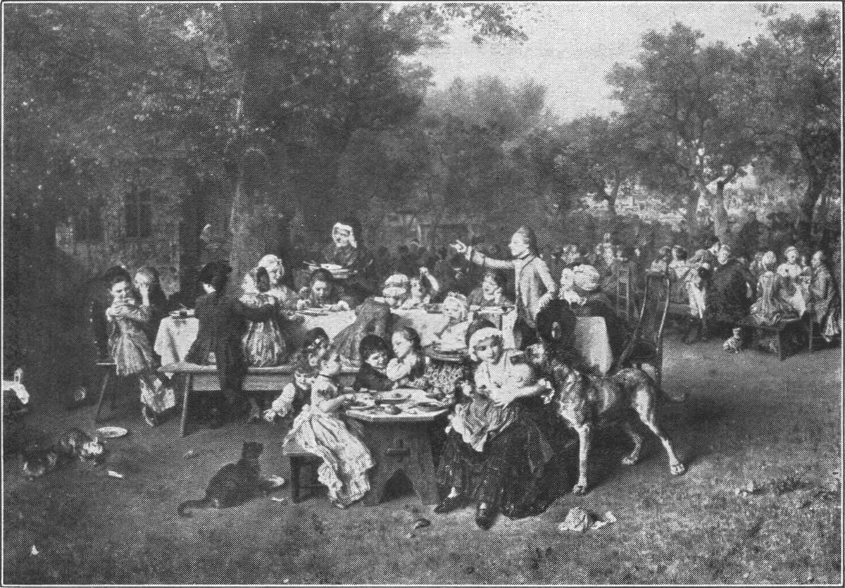 Der Krieg zwang Leibl, Paris zu verlassen. Aber er blieb zunächst in der gleichen Schaffensbahn. Immer heller, immer leichter wurden seine Farbtöne, immer freier, immer treffender, dem reinen Seheindruck immer gemäßer seine Farbenformeln. Hauchige blütenhafte malerische Gebilde sind damals entstanden, wie das Bildnis einer Nichte Leibls, Nina Kirchdorff, heute in der Pinakothek. Diese Entwicklung gipfelt in dem herrlichen, leider unvollendeten Bild der „Tischgesellschaft“ (Köln, Wallraf-Richartz-Museum), an dem er von 1871 bis 1874 arbeitete. Eine ganz strenge, schwierige Farbenrechnung,[S. 323] ein großartiger Aufbau der Farbenflächen zu reinem Einklang, dient hier als äußeres Mittel doch nur dazu, seelisch Tiefes auszusprechen, das stille Zusammensein von Menschen, ihr Dasein an sich als Gefühl füreinander.