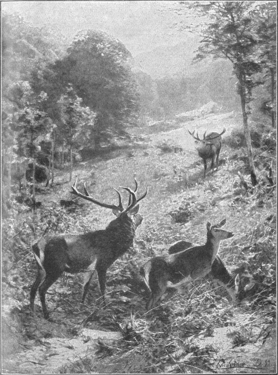 Es sind ein Paar kräftige Knaben, die sich hier auf dem Bilde gegenüberstehen, „Zehnender“, wie man sie nach dem Geweih nennt, d. h. sie haben fünf Enden an jeder Stange. Im ersten Jahre schiebt der Hirsch nur ein Paar Spieße aus, im zweiten manchmal ein Paar Gabeln, daher Gabler genannt, meist aber schon ein Geweih mit drei Enden an jeder Stange, so daß er zum Sechsender geworden[S. 303] ist. In der Regel wird er dann mit jedem Jahre stärker, es folgt der Achtender, der Zehnender. Die starken Geweihe über zwölf Enden sind immer seltener geworden.