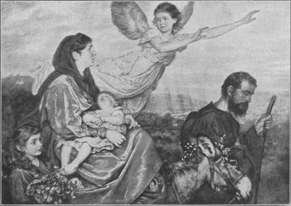 Seht euch die „Flucht nach Ägypten“ an. Es ist eines seiner schönsten und innigsten Bilder. Ihr kennt die Stelle der Heiligen Geschichte? „Da die Weisen aus dem Morgenlande aber hinweggezogen waren, siehe, da erschien der Engel des Herrn dem Joseph im Traum und sprach: Stehe auf und nimm das Kindlein und seine Mutter zu dir und fliehe in Ägyptenland und bleibe allda, bis ich dir sage; denn es ist vorhanden, daß Herodes das Kindlein suche, dasselbe umzubringen. Und er stand auf und nahm das Kindlein und seine Mutter zu sich bei der Nacht und entwich in Ägyptenland...“ Ernst und behutsam führt Joseph das brave Eselein durch das blühende, grüne Land. Er sieht nicht vor, nicht hinter sich. Sorge beugt seinen Nacken und macht seinen Schritt schwer. Aber Maria, die mütterliche Frau, die still und gefaßt auf dem geduldigen Grautier sitzt, hat den Blick hoffnungsvoll erhoben. Ihr Auge hängt gläubig an der lichten Engelsgestalt, die in holdernster Kindlichkeit neben ihr schwebt und mit tröstender Gebärde in die Ferne, in eine glücklichere Zukunft der Geborgenheit deutet; strömendes Sonnenlicht verklärt ringsum das Land wie eine göttliche Verheißung, als sollten alle Not und Trübsal der geängstigten Kreatur sich über ein Weilchen in Frieden und Seligkeit wandeln. Im Schoße der Mutter aber schlummert tief und glücklich das Jesuskind dem Ziele entgegen. Und noch ein andrer kleiner Himmelsgesandter[S. 307] gibt Eltern und Kind das Geleit, er trägt Blumen im Arm und hat Blüten auf den Leidensweg der heiligen Familie gestreut und auch das getreulich schreitende Tierlein mit den bunten lebendigen Sternen geschmückt...