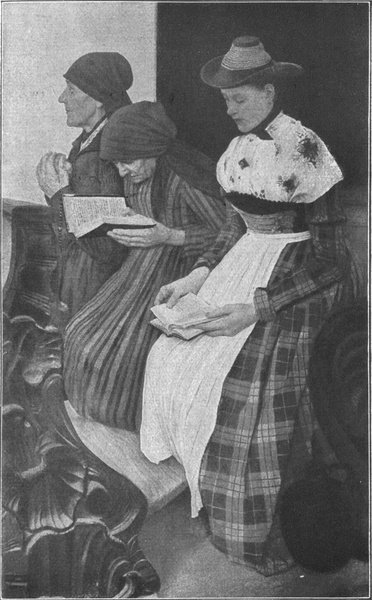 Gewiß habt ihr schon das eine oder andere davon gesehen und liebgewonnen; wenigstens wohl einen der farbenschönen Steindrucke, die von des Meisters Hand in die Welt hinausgegangen sind. Vielleicht den „Geiger“, den verträumten Schwarzwaldjungen, der in blauer Nacht, von den silbernen Strahlen des langsam heraufsteigenden runden Mondes umspielt, im kleinen Bauerngarten sitzt und seine junge Sehnsucht, sein Hoffen und Wünschen in leisen, schwebenden Melodien in das traumstille Dunkel hinausklingen läßt, oder den „Säemann“, der hoch aufgerichtet, ernst und feierlich über die feuchtbraune Erde schreitet und in breitem Wurf den Samen in die Scholle streut, daß er keime und Frucht bringe, oder das „Schwarzwaldhaus“, das uns der Maler im ersten Frühlingsscheine zeigt, wenn die Bäume noch kahl sind und die Luft durchsichtig klar ist;[S. 305] hell läßt er die Sonne auf dem braunen Gebälk spielen, fleißige Frauen arbeiten im Gärtchen hinter dem Lattenzaun, und lenzselig kräht der bunte Haushahn in den Morgenglanz hinein.