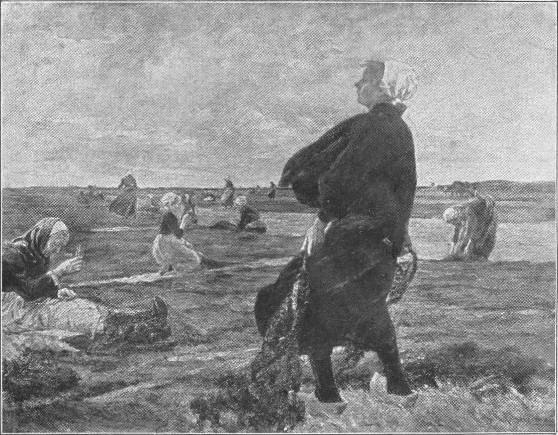 Man kann dafür kein stärker beweisendes Beispiel geben als die Netzflickerinnen. Weiter, flacher Strand an grauem Tag. Vom Meere her geht ein scharfer Wind. Man spürt seine Nähe, schmeckt die salzige Luft und ihre Frische. Weithin sind über den Plan Netze gebreitet. Frauen in der Tracht des Landes sind bei ihnen beschäftigt, spreiten sie gebückt aus, ziehen kniend den Faden durch die Nadel, bessern hockend die zerrissenen Maschen aus. Und diese Landschaft mit ihren mannigfaltig bewegten Figuren bildet den Hintergrund, von dem sich die große Gestalt vorne klar abhebt: eine junge Frau, die mit ihren Netzen herankommt, und deren Haar und Kleider die starke Brise bewegt.