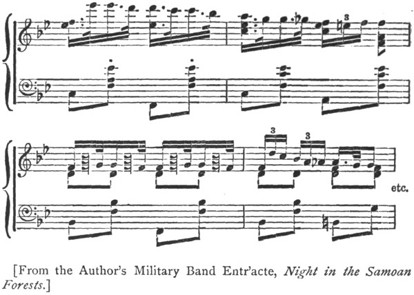 The island country is very beautiful. In the springtime the landscapes and valleys are dotted with yellow things called primroses; other wild flowers grow on the hedgerow banks. Little birds sing in old trees to the sunsets; the grass grows, and grows high ere they cut it down. The woods smell of peat; the native homesteads in the villages burn wood, and you can smell its delightful odour along the lanes as you tramp by. It is a beautiful country; but violin-playing, music and poetry are not appreciated by the natives as they are appreciated in the South Seas.