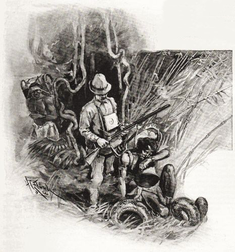 What gigantic trees are seen in that forest! Some rival in size the great California trees. These are the giants of the forest, and they rise two or three hundred feet above the other trees, upon which they look down. They are like sentinels watching over the country. Some of these big trees are worshipped by the natives. Under the roof of the mighty branches is the thick jungle, where no man can penetrate easily. The jungle is the undergrowth of the forest. It is made up of younger trees: lianas, thorny creepers, kinds of bamboo and rattan, thorny trees, sword-grass that cuts like a razor, and aloes plant in the swampy parts. In many places the explorer cannot see a yard off from where he stands.