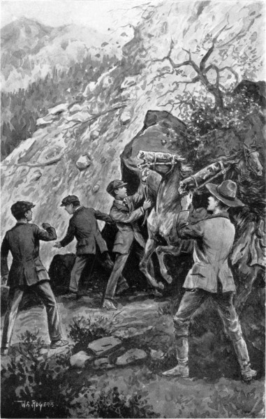 Carrying as many of the sacks as they could, they scrambled up the débris-covered side of the mountain to the spot in front of the cave in which they had spent the night. To their delight, they found their horses safe. The slide had not reached them, nor had it disturbed the cavern.