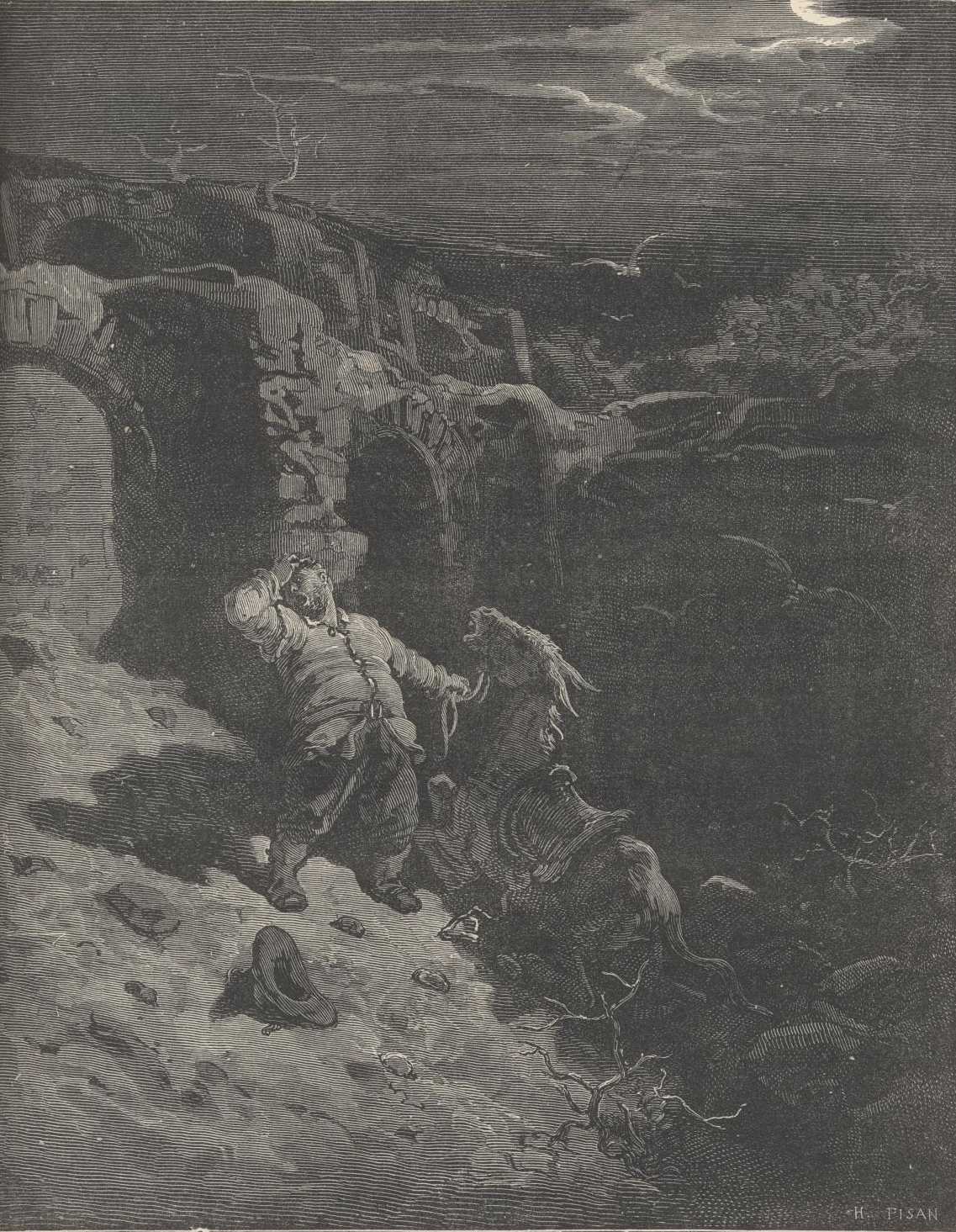 The length of time he delayed with Ricote prevented Sancho from reaching the duke's castle that day, though he was within half a league of it when night, somewhat dark and cloudy, overtook him. This, however, as it was summer time, did not give him much uneasiness, and he turned aside out of the road intending to wait for morning; but his ill luck and hard fate so willed it that as he was searching about for a place to make himself as comfortable as possible, he and Dapple fell into a deep dark hole that lay among some very old buildings. As he fell he commended himself with all his heart to God, fancying he was not going to stop until he reached the depths of the bottomless pit; but it did not turn out so, for at little more than thrice a man's height Dapple touched bottom, and he found himself sitting on him without having received any hurt or damage whatever. He felt himself all over and held his breath to try whether he was quite sound or had a hole made in him anywhere, and finding himself all right and whole and in perfect health he was profuse in his thanks to God our Lord for the mercy that had been shown him, for he made sure he had been broken into a thousand pieces. He also felt along the sides of the pit with his hands to see if it were possible to get out of it without help, but he found they were quite smooth and afforded no hold anywhere, at which he was greatly distressed, especially when he heard how pathetically and dolefully Dapple was bemoaning himself, and no wonder he complained, nor was it from ill-temper, for in truth he was not in a very good case. "Alas," said Sancho, "what unexpected accidents happen at every step to those who live in this miserable world! Who would have said that one who saw himself yesterday sitting on a throne, governor of an island, giving orders to his servants and his vassals, would see himself to-day buried in a pit without a soul to help him, or servant or vassal to come to his relief? Here must we perish with hunger, my ass and myself, if indeed we don't die first, he of his bruises and injuries, and I of grief and sorrow. At any rate I'll not be as lucky as my master Don Quixote of La Mancha, when he went down into the cave of that enchanted Montesinos, where he found people to make more of him than if he had been in his own house; for it seems he came in for a table laid out and a bed ready made. There he saw fair and pleasant visions, but here I'll see, I imagine, toads and adders. Unlucky wretch that I am, what an end my follies and fancies have come to! They'll take up my bones out of this, when it is heaven's will that I'm found, picked clean, white and polished, and my good Dapple's with them, and by that, perhaps, it will be found out who we are, at least by such as have heard that Sancho Panza never separated from his ass, nor his ass from Sancho Panza. Unlucky wretches, I say again, that our hard fate should not let us die in our own country and among our own people, where if there was no help for our misfortune, at any rate there would be some one to grieve for it and to close our eyes as we passed away! O comrade and friend, how ill have I repaid thy faithful services! Forgive me, and entreat Fortune, as well as thou canst, to deliver us out of this miserable strait we are both in; and I promise to put a crown of laurel on thy head, and make thee look like a poet laureate, and give thee double feeds."