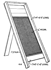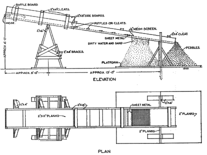 Should sand require washing the simplest way for small quantities is to build a loose board platform from 10 to 15 feet long, with one end higher than the other. On the lower end and sides nail 2 by 6 inch boards. Spread the sand over the platform in a layer 3 or 4 inches thick and wash with water. The water may be supplied by any means which will cause agitation of the sand and allow the lighter material to run off with the water. When pressure or a head is obtainable the water is most easily applied by means of a garden hose. The washing should be started at the higher end and the water allowed to run through the sand and over the 2 by 6 inch piece at the bottom. Figure 1 illustrates a convenient trough for washing larger quantities.