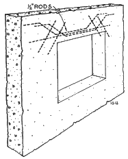 It will be found generally satisfactory, where no heavy or concentrated load occurs over an opening and the span is not more than 4 feet, to place two rods three-eighths of an inch in diameter in the bottom of the lintel, so that there will be 1 inch of concrete below them. Two diagonal rods should be placed at each top corner of a window or door, as shown in Figure 18. When the opening is between 4 and 8 feet the rods should be bent up as shown in Figure 19 and when between 8 and 12 feet, three one-half inch rods should be used, two of them being bent.