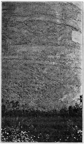 Joints and imperfections in the forms are reproduced on the concrete surfaces. Patches of honeycomb and rough places are left where the mortar has run out of the forms or where the concrete has not been properly placed. Such imperfections do not necessarily affect the strength of the concrete, but they do detract from the appearance « 25 » (see Fig. 14). Too of ten the finishing of the concrete work in even the more important farm buildings is neglected. With little extra trouble exposed surfaces can be given a finish which will add to the attractiveness and hence the value of the completed work. Rubbing off the form marks and pointing up depressions or holes greatly improves the appearance of the work. The rubbing may be done with a wooden float or hard-burned brick, using a little sand and water as an abrasive and a 1:2 mortar for pointing up. The surface can be worked best if the forms are removed within 24 hours or before the concrete has set too hard. After the concrete has hardened it may be necessary to use a carborundum block for rubbing.