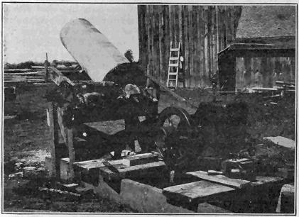 There are numerous types and various sizes of batch mixers. A one-bag batch machine is most suitable for general work, though there are smaller mixers that may prove handy. Some of the smallest sizes are operated by hand, but the medium and large sizes are power operated. Mixers can be had with or without the power plant attached and may be stationary or on wheels, which facilitate moving to different sites. Engines used for sawing wood, the larger ones used for pumping water, and tractors furnish sufficient power to operate an average mixer. Figure 7 shows a homemade mixer built of discarded farm implement parts and operated by the farm engine.