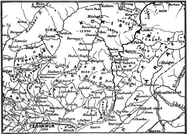 Above Ghazi, and at a distance of about twelve miles on the same side of the river, are the villages known by the general name of “Thorbela.” The word locally means “Black Island,” after an island which was situated in front of them, but was washed away in the floods of 1842. Since that date many of the huts have been erected at some distance from the banks. The village is an important one, and contains a thriving and industrious community. To get to “Thorbela” the traveller has to pass through the small village of “Mohat,” between which and Ghazi is the ferry across the Indus to the populous town of “Topi.” This town contains the same admixture of races as at Ghazi, but in addition a larger xiiproportion of the “Juddoon” tribe who speak the “Pushtu” language, which has some similarity to the Semitic.