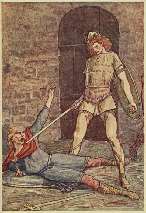 The captain laughed again, and stretched forth his hand, whereupon Feargus struck him with his sheathed sword that he fell senseless. Then quickly turning their horses’ heads they wheeled suddenly, leaving the soldiers behind them, and dashed across towards the gate of the city. There they entered and rode up to the king’s hall and were surrounded by his people, and the party which had been sent to bring them in now coming, took them to the king, who ordered that they should be cast into prison, for Feargus did not tell them that he was king Nechtan’s son, thinking they might deem him so rich a prize that they would not readily release him. Then was Feargus much downcast, for his spirits had been high at thought that they[223] were near his own land after so many wanderings.