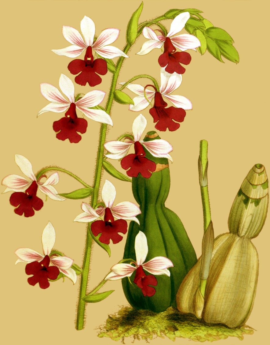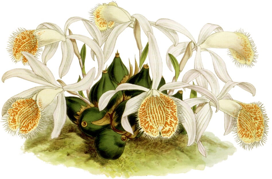 Epiphytal. Pseudobulbs roundish-ovate, plump, two-leaved, with brownish lanceolate bracts at their base. Leaves narrowed below into a petiole, elliptic-oblong, with a stout costa, plicate, leathery, one and a half-inch wide, and from six inches to a foot long including the petiole, of a lively green. Peduncles erect, rigid, springing from between the leaves, terete, terminating in a dense raceme of flowers, below which are several pairs of abortive imbricated pale brown bracts. Flowers large, white, with a peculiar sooty or pitchy stain covering the inner side of the lip, breaking out into fine pencillings towards the margin; sepals white, oblong-ovate, broadish at the base, narrowed to the acute point; petals white, lanceolate acute, broadest at the base; lip white, oblong, three-lobed, saccate at the base, fringed with brown-based hairs on the anterior margins, and bearded with hairs entirely dark brown on the three veins of the disk, forming three shaggy crests, the side lobes tinged with pale flesh colour or pink outside. Column white, deflexed, bilobed at the end.